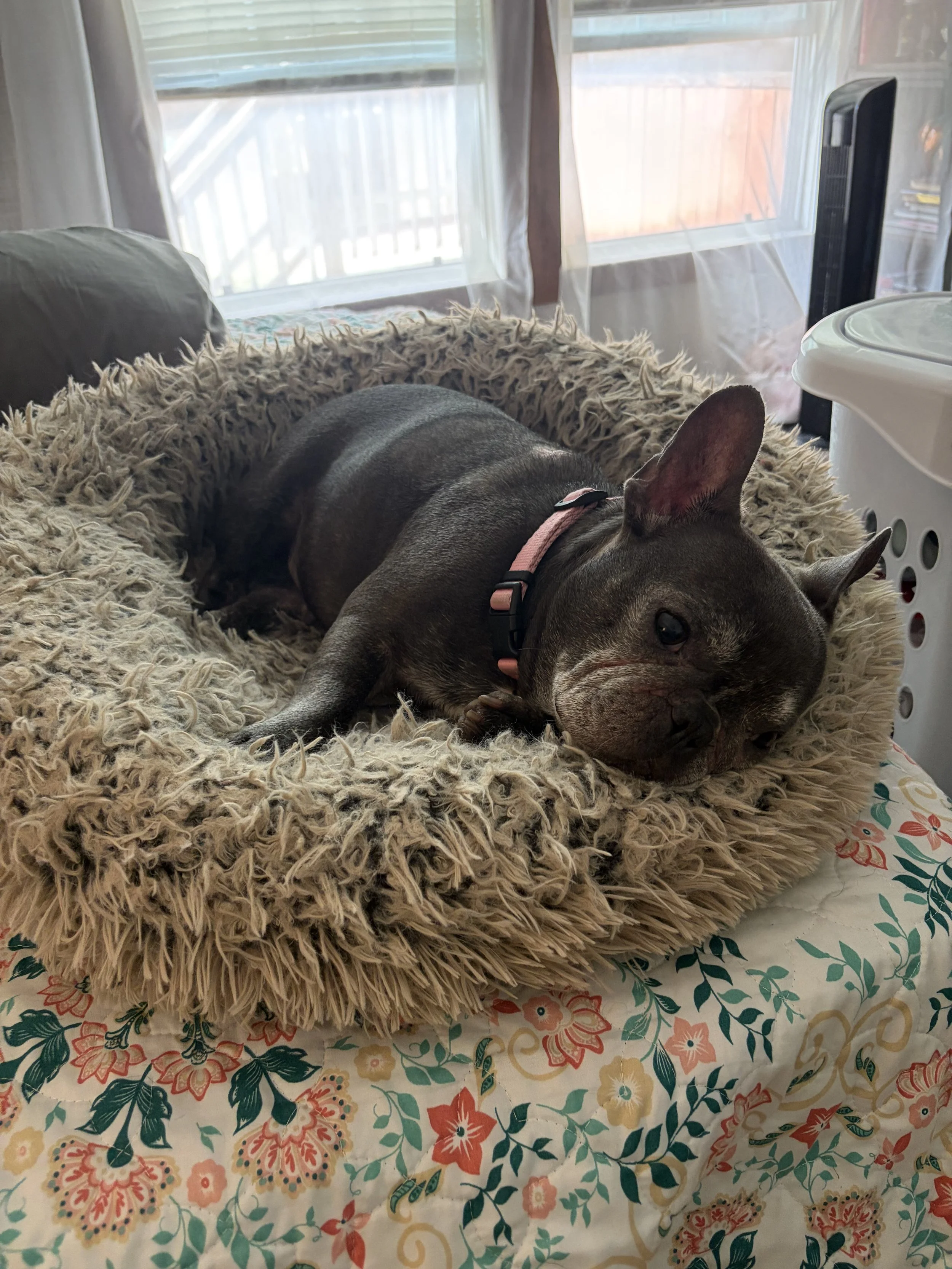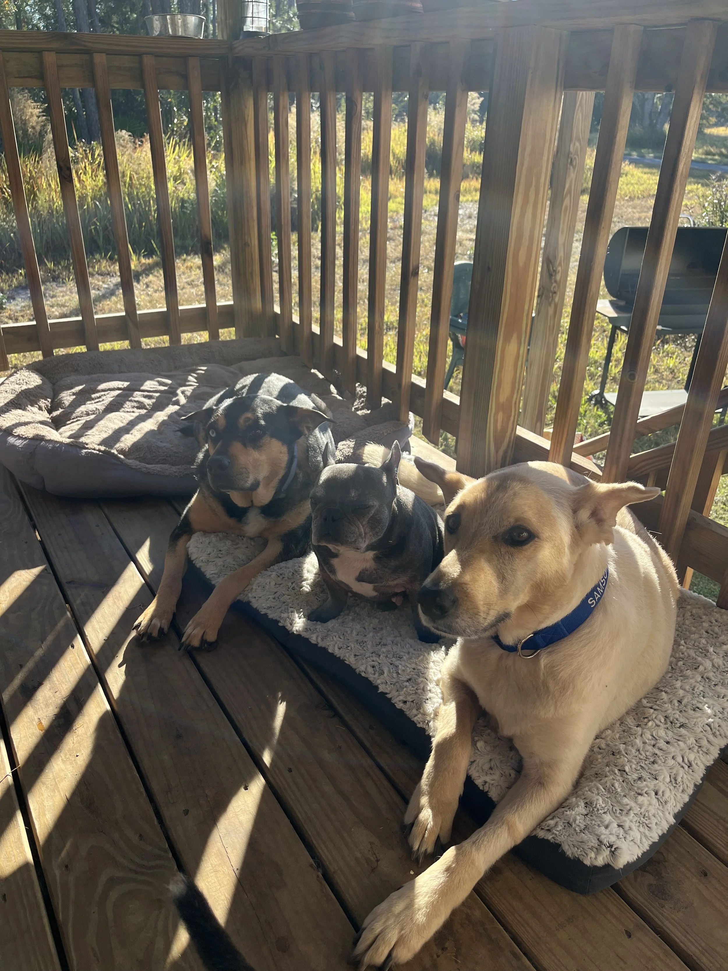 Our residents live kennel-free on our 2.5-acre sanctuary in Middleburg, Florida. They nap on couches. They wander the yard at their own pace. They receive medications on schedule. They are monitored closely. And when the hard days come, they are held.